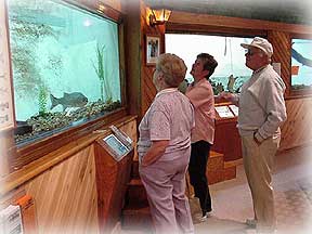 The Aquarium Room contains twelve, 400-600 gallon aquariums; each displaying fish species native to Kansas or that have been successfully introduced into Kansas. On the east wall are two wall panels. One featuring the early history of the Pratt Hatchery. The other features the catfish rearing program along with a working model of Seth Way's ingenious incubating trough. Over one hundred and twenty-eight species of birds and their eggs are displayed in the Bird Room. Across from this room you can enjoy duplicating the tracks of Kansas animals using the vinyl Replica tracks. Also, numerous interactive exhibits will test your knowledge of Kansas wildlife.