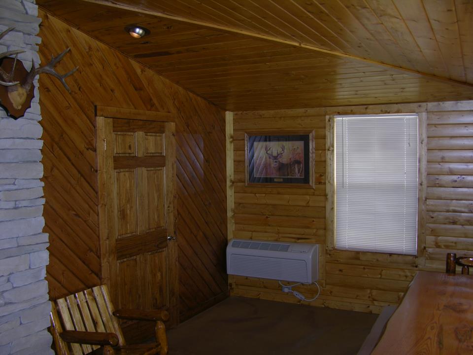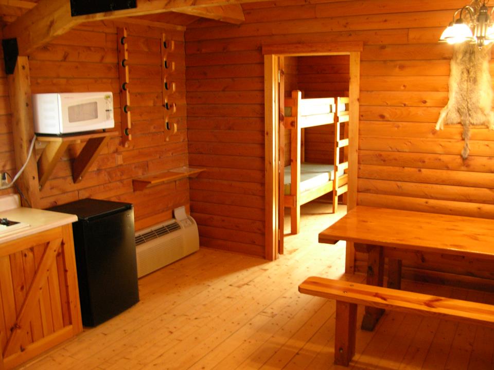 We offer two, two bedroom rustic cabins; "Whitetail Ridge" and "The Trapper's Lodge". Each are equipped with two, twin over full bunkbeds, electricity, air conditioning and heating, table and chairs, a small refrigerator, coffee maker and a microwave. Just outside, under the shaded patio, a charcoal grill, picnic table and fire ring; two exterior outlets are also available for your convenience.