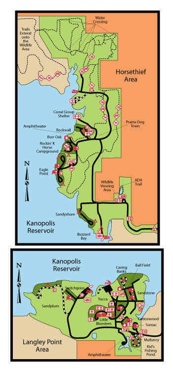 Kanopolis State Park is offering six deluxe cabins as a year-round alternative camping opportunity. These are especially beneficial for individuals who enjoy the park experience but would rather not “rough it.” The cabins feature easy access to the reservoir’s fishing, boating, water-skiing, etc. opportunities. They are also close to Smoky Hill Wildlife Area which offers excellent hunting opportunities in the area. The Arapaho cabin is partially handicap accessible; the Cheyenne cabin is not handicap accessible, having only steps, and the remainder of the cabins are fully handicap accessible.