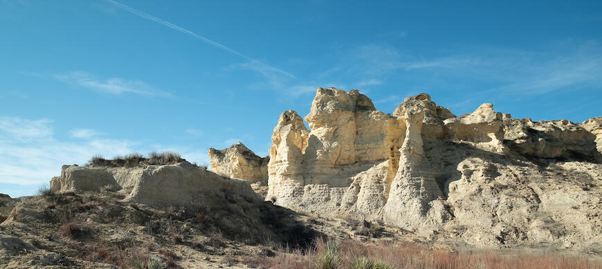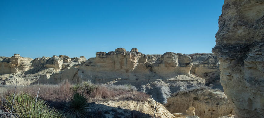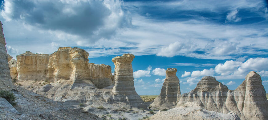 Little Jerusalem Badlands State Park showcases a mile-long stretch of 100-foot-tall spires and cliffs of eroded Niobrara Chalk, a layer of rock deposited about 85 million years ago. Niobrara Chalk was formed by sediment that settled at the bottom of an inland ocean called the Western Interior Seaway which covered most of central North America roughly 140 to 70 million years ago. The sediment became compressed over time, and the seaway floor was lifted by the same tectonic shifting that formed the Rocky Mountains.