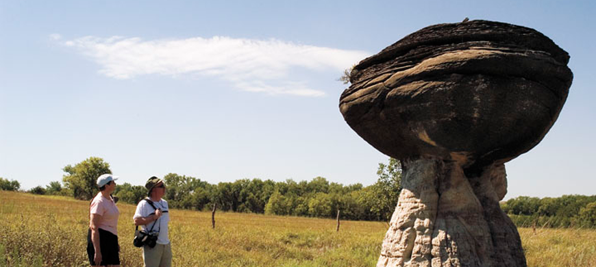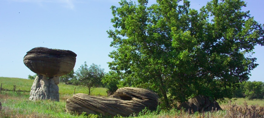 Resembling giant mushrooms rising above the horizon, the Dakota formations of Mushroom Rock State Park are the remains of beach sands and sediments of the Cretaceous Period, the interval of geologic time from about 144 to 66 million years ago. Sandstone and sedimentary rock is held together by natural cement. The concretions that make up Mushroom Rocks are cemented calcium carbonate. The largest rock measures 27 feet in diameter.