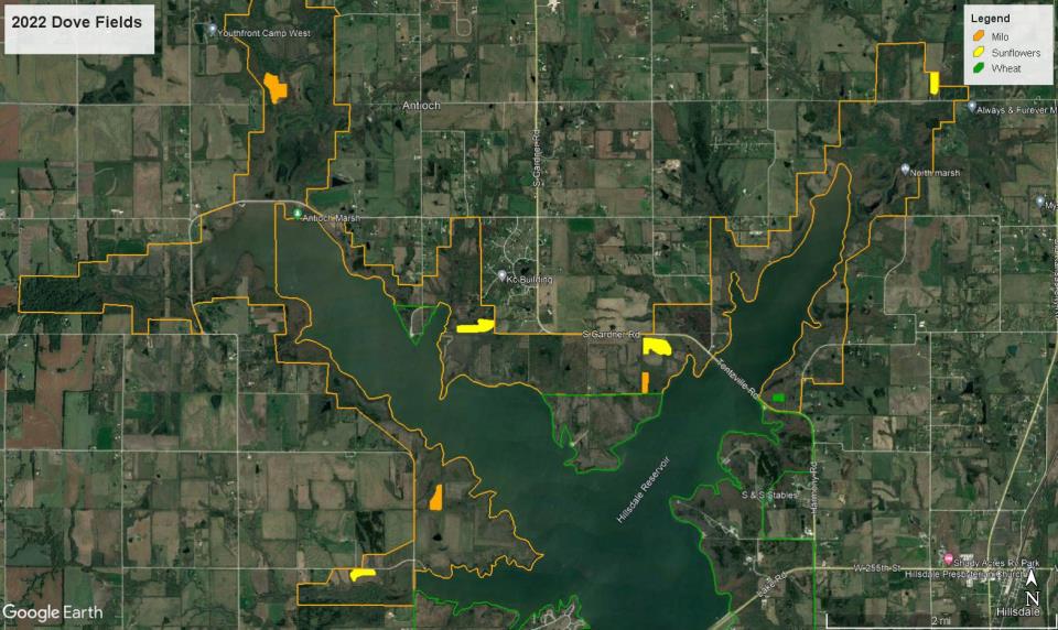 - Dove: Sunflower and wheat fields provide forage for migrating mourning doves. Each year approximately 150 acres are planted to sunflowers and wheat, and these 'dove fields' are very popular for hunters during the dove hunting season. Annually, between 500 and 1,000 doves are harvested on the Wildlife Area.