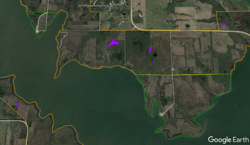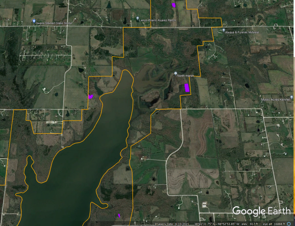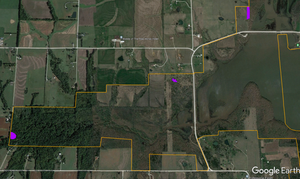 Habitat types include grassland, forest, wetland, ponds, and farmland. Grasslands vary from open grass- and wildflower-dominated fields to brushy shrublands abundant with dogwood, plum, sumac, and cedar. More than 1,000 acres of mature oak, hickory, and walnut forest provides hard mast for forest wildlife. Six moist soil wetlands are managed for ephemeral and emergent vegetation for native wildlife, particularly migrating shorebirds and waterfowl. Also, more than 20 ponds can be found across the Wildlife Area; fishing quality unknown. Approximately 500 acres of the Wildlife Area is planted to corn, soybeans, sunflowers, and winter wheat, annually. Additional crops are planted as food plots. Food plot locations may change from year-to-year.