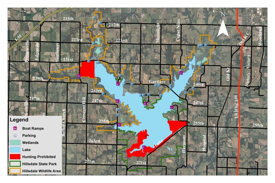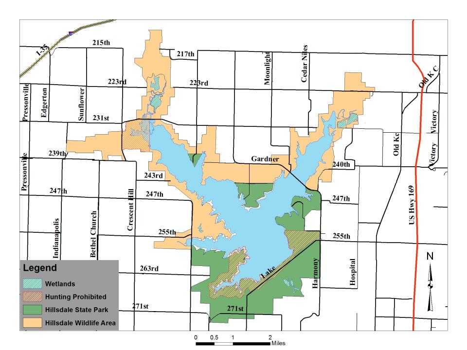 Hunting is permitted on approximately 10,000 acres of land and water at Hillsdale Lake. Hillsdale Wildlife Area and Hillsdale State Park provide hunting opportunities on 7,200 land acres. A Youth-Mentor & Novice hunting area includes the 'Youth' or Big Bull Marsh and surrounding uplands east of Spoon Creek Rd on 223rd St. Access to this area is reserved for youth and novice hunters (check the annual hunting regulations guide for more information). A waterfowl refuge is closed to all activities from October 1 through January 15, annually. During construction of Hillsdale Reservoir, much of the standing timber was left standing to provide fish habitat. Approximately 4,500 acres of water are open to fishing.