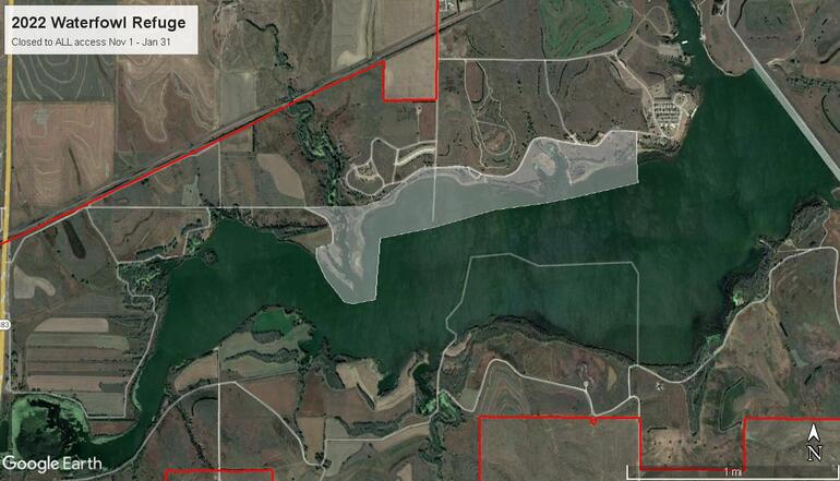 The area attracts good numbers of waterfowl allowing for good opportunities to hunt all around the area. With high numbers of waterfowl, the management takes a high priority in these species. Starting November 1st, the middle portion of the reservoir is designated as a waterfowl refuge and is closed until January 31st. While duck hunting can be good on the area goose hunting takes place mainly on the surrounding private grounds because hunting pressure is generally too great for feeding patterns to become established on the public lands and provide consistent successful goose hunting.