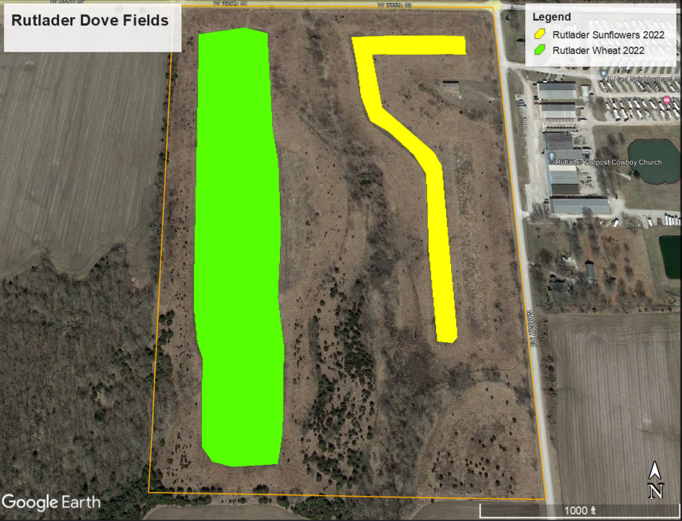 Rutlader Wildlife area consists of a mix of farmland and old fields divided by brushy draws. Approximately 15 acres of native grass field borders have been planted. Fields are typically planted to sunflowers, wheat, millet, and clover. Decent hunting opportunities can be expected for cottontails, doves, turkey, and white-tailed deer. Rutlader is divided into two tracts by Metcalf Rd. Special care should be taken when hunting at Rutlader because neighboring houses and the Rutlader Outpost RV Park border the Wildlife Area.