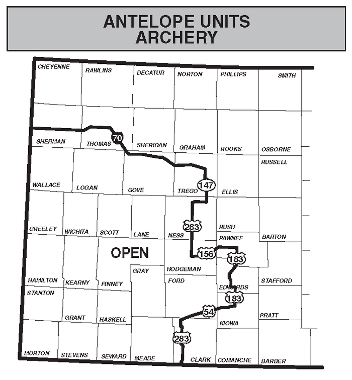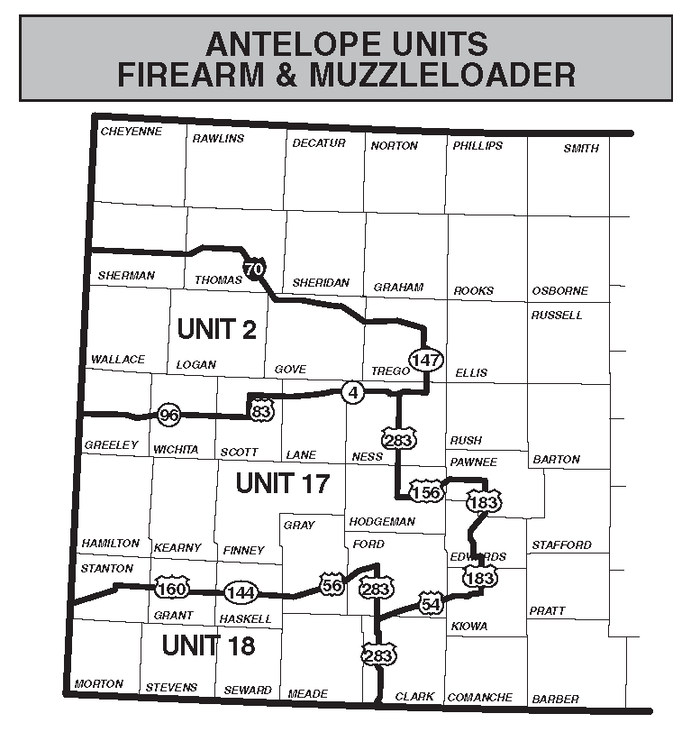 The first pronghorn hunting season in Kansas occurred in 1974. Nearly 500 hunters applied for the 80 permits available. Seventy pronghorns were harvested. Today, hunting is restricted to three management units that include parts or all of Sherman, Thomas, Wallace, Logan, Gove, Trego, Greeley, Wichita, Scott, Lane, Ness, Hamilton, Kearny, Finney, Gray, Hodgeman, Ford, Stanton, Grant, Haskell, Morton, Stevens, Seward, Meade and Clark counties. Firearms and muzzleloader permits are limited to residents only, and about 170 permits are authorized each year. Archery hunters can purchase pronghorn permits over the counter.