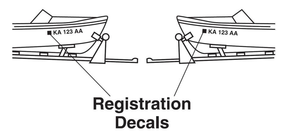 A registration decal will also be issued. This expiration decal remains on your boat for the duration of the three-year registration period. Registration decals are displayed in line with the assigned number on each side of the boat.