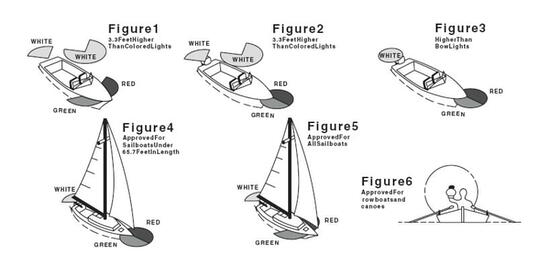 - Sailboats under sail must have navigation lights shown in figures 4, 5, or 6. Sailboats under power must conform to motorboat navigation light requirements.